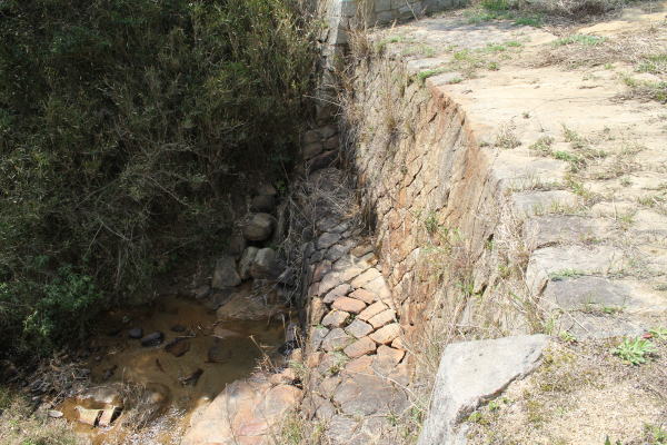 谷積の水叩きが設けられている。右岸側に長老塚池があったが1945年枕崎台風により決壊し埋まった。 |